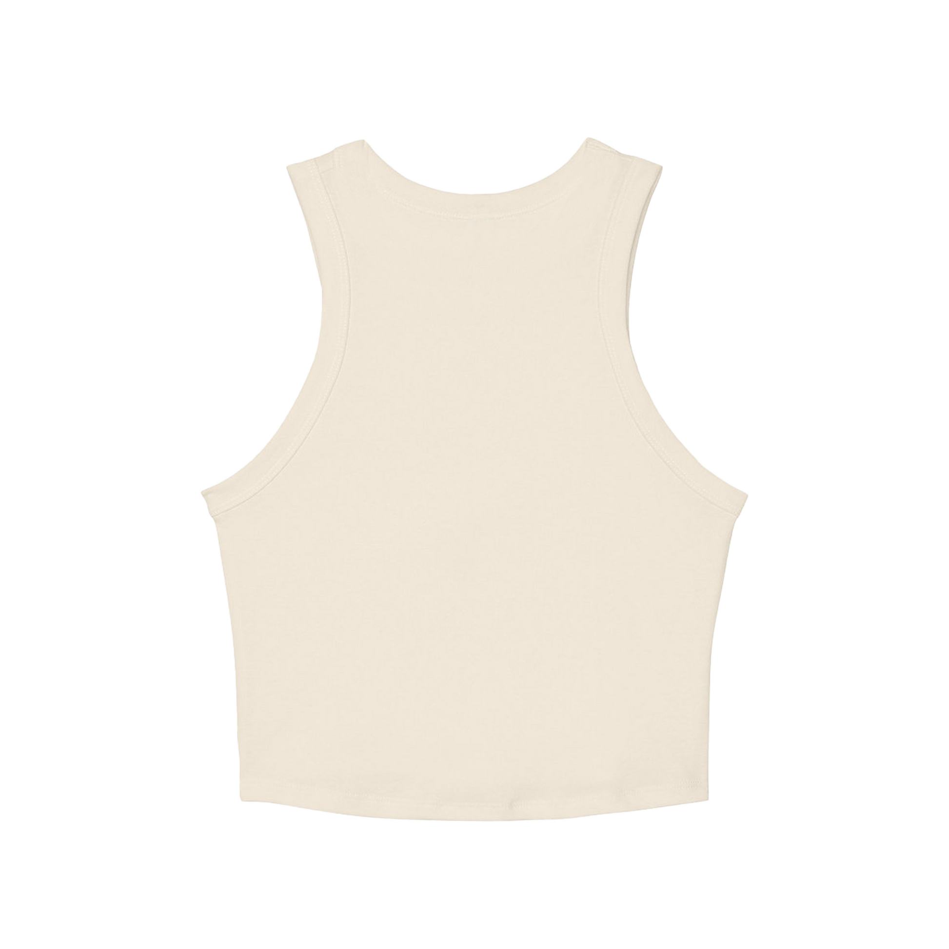 This beige crop tank top features a minimalistic "KUSHIE" logo across the chest. Made from soft, durable fabric, it's comfortable and perfect for casual wear or layering. The cropped length and fitted design create a flattering silhouette.
