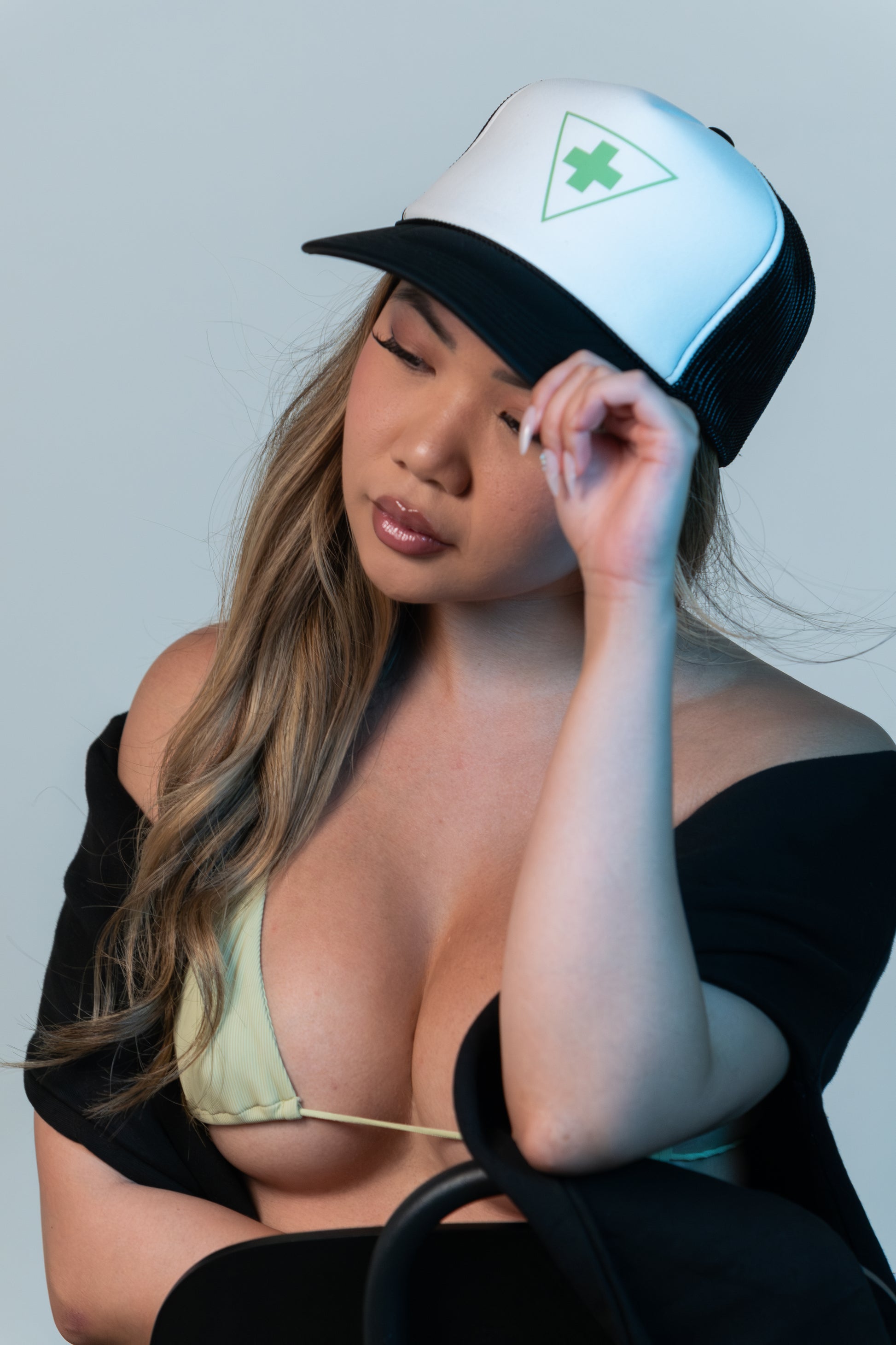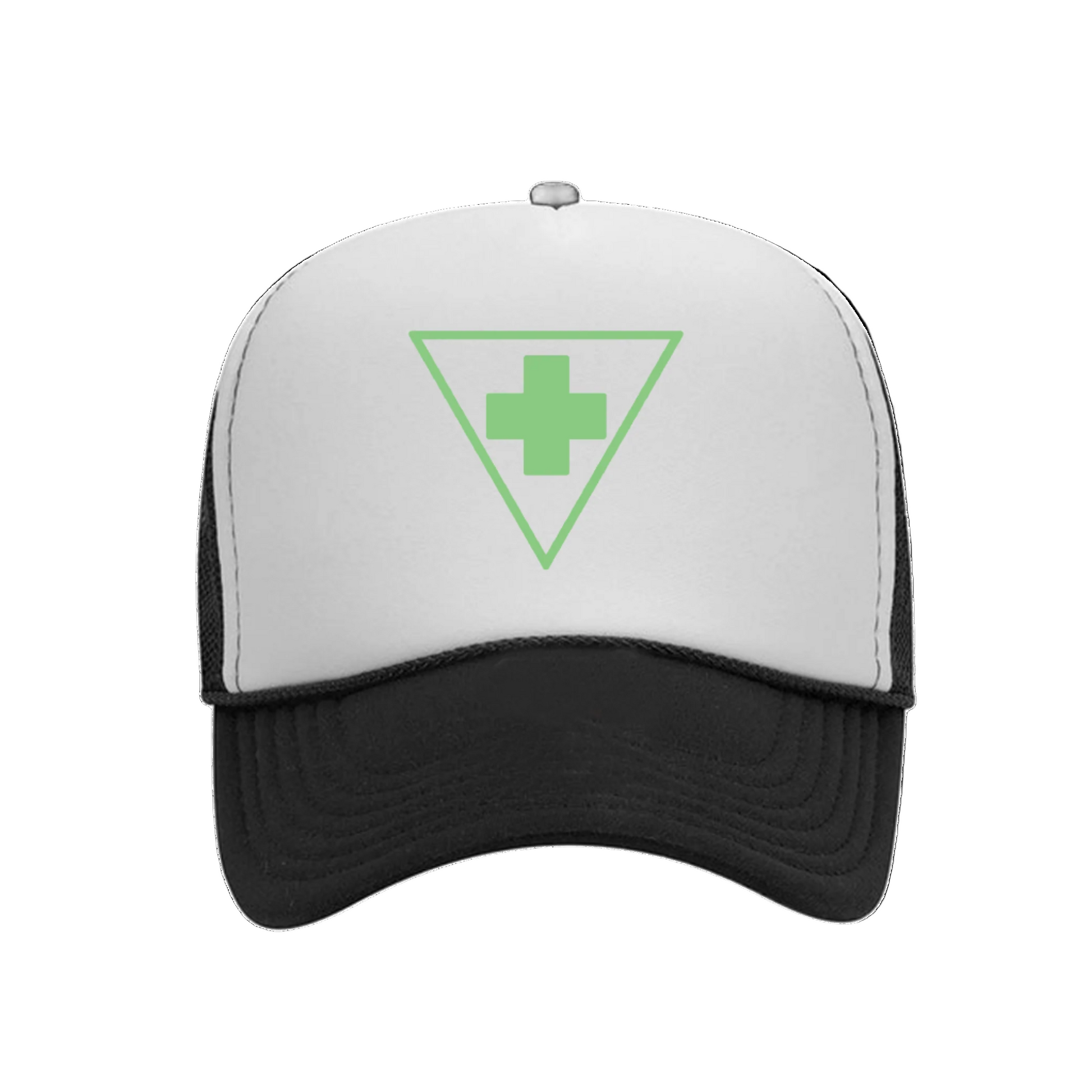 This black and white trucker hat features a bold green medical cross on the front. With a breathable mesh back and adjustable snapback closure, it offers comfort and a perfect fit.